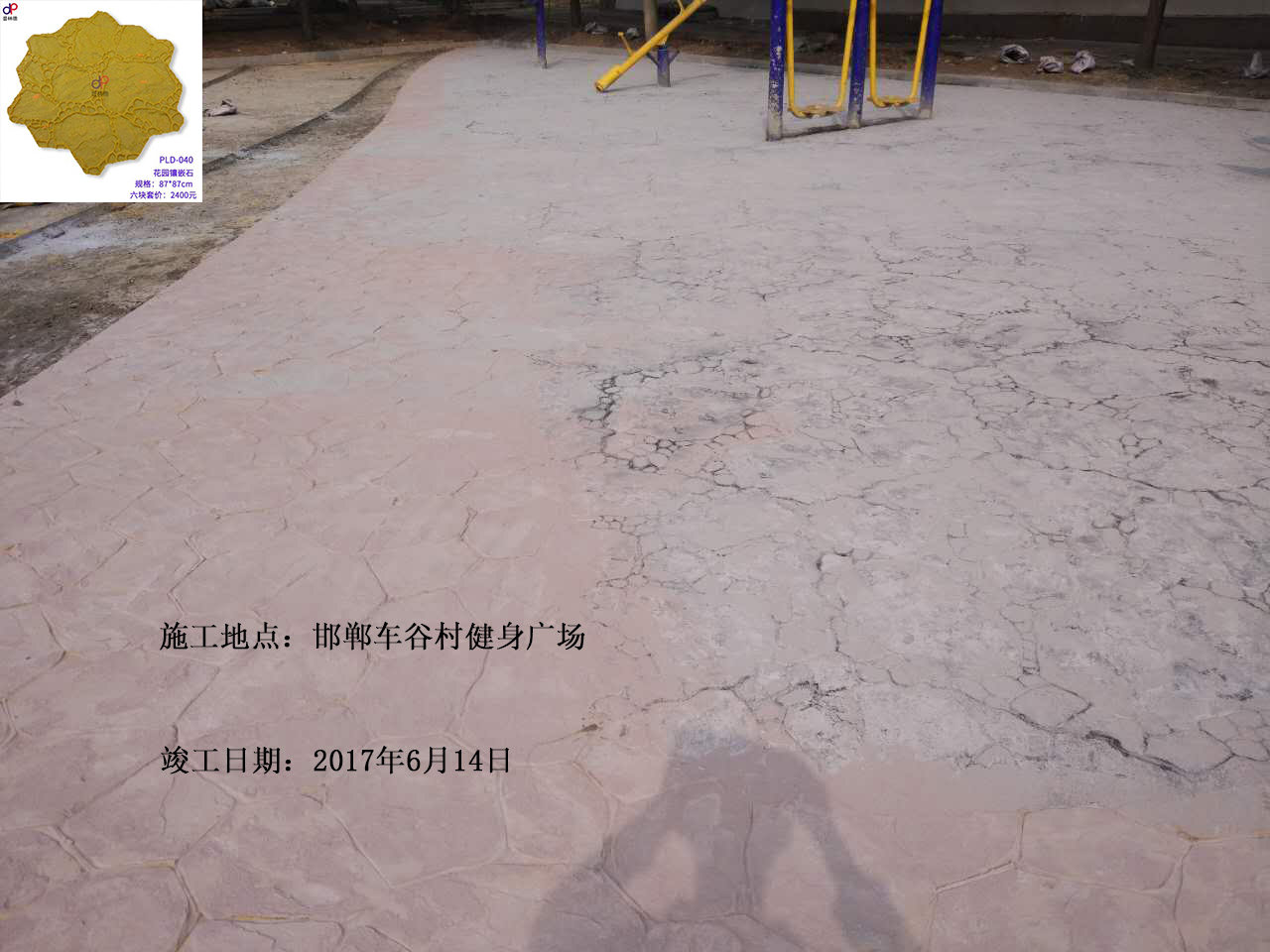 项目名称:河北省邯郸车谷村健身广场压模压花地坪工程 项目地址:河北省邯郸车谷村 竣工时间:2017年06月14日 项目规模:中型 供应厂家:普林德工厂